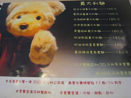 餐點為義大利麵和焗烤類,搭配半套餐70元或全套餐100元,差別於100元除了湯和飲料,