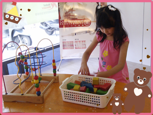 今天預約就診治療妞妞的七顆蛀牙,看診環境寬敞明亮,有個小區域放置積木和童書讓等候的孩童使用,