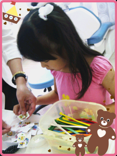 (媽咪想牙醫還要練就摺汽球本領喔!)最後妞妞只選了3張貓咪貼紙。也再預約下次治療右邊的蛀牙囉!
